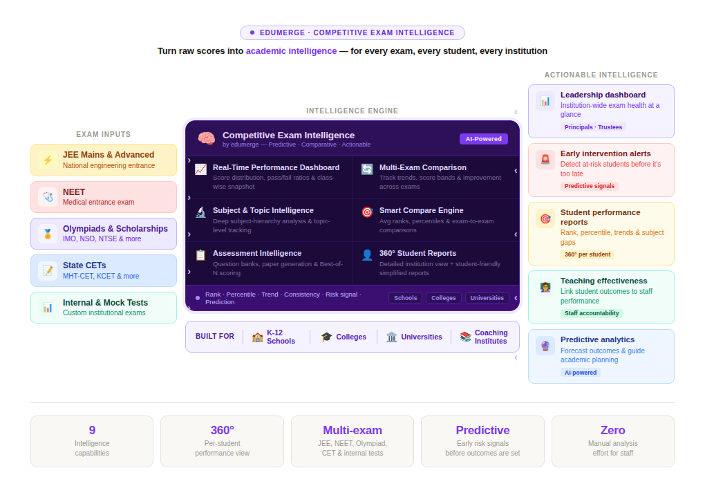 See how edumerge's Competitive Exam Intelligence helps improve JEE, NEET & Olympiad outcomes with data-driven insights and early intervention.